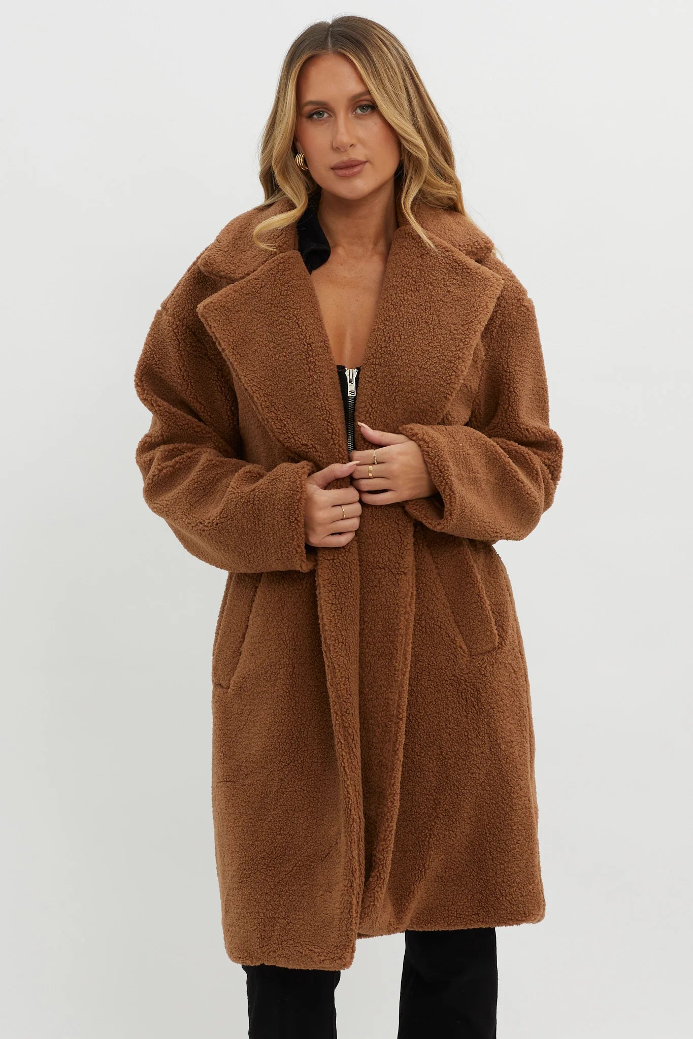 Snuggle up in our chic Alaska coat. Featuring a super soft, sherpa fabric and a collared neckline. It's perfect for cooler days when you need to get cozy without sacrificing style. Throw it on over your fave Fall 'fit or a satin mini dress and tights for a night out with the girls.