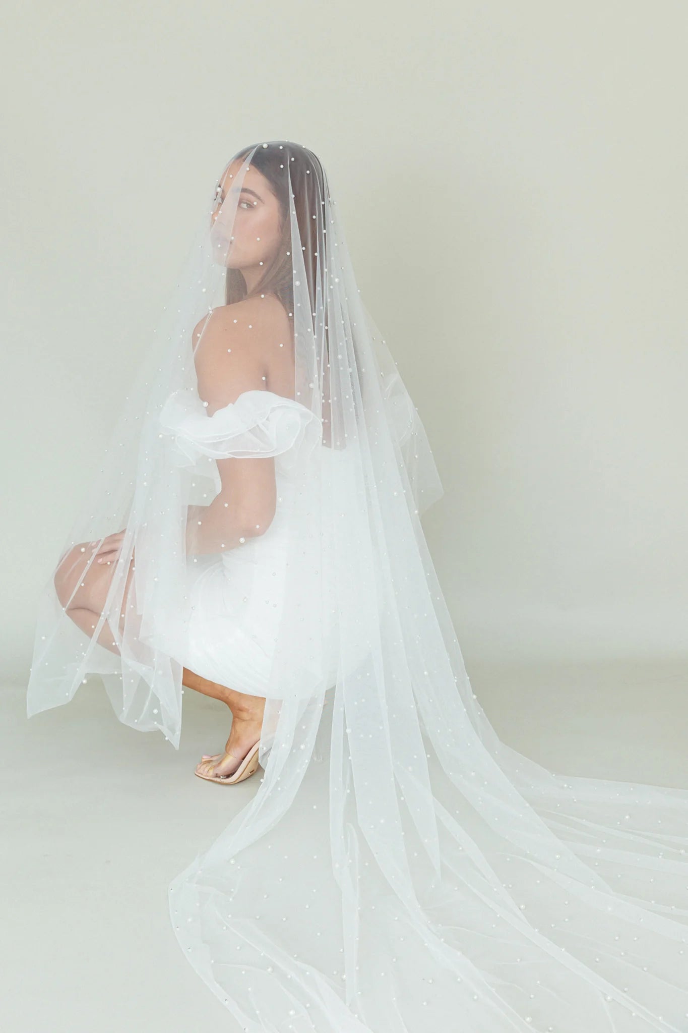 Complete your wedding day look with our gorgeous Angela veil. We are in love with the pearl embellishment detail. Team it with our Marietha dress and satin pumps for an unforgettable look.