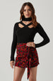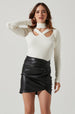 The Antonella Sweater features a ribbed knit construction. Mock neck leads to a cross cutout accent on the front. Long sleeves.