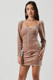 The Ellsmere Dress features a smooth velvet construction with a sweetheart neckline. Ruched bodice leads to an abbreviated hemline. Long sleeves with puff shoulders and ruched cuffs.