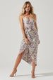 The Giselle Dress features a soft floral print and plunging sweetheart neckline that leads to a twist front bodice. Asymmetrical hemline. Adjustable straps. Concealed back zip closure.
