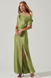 The Monroe Dress features a satin finish perfect for special occasions. Off-shoulder neckline leads to a draped bodice and cinched waist. Side slit accent. Maxi-length skirt.