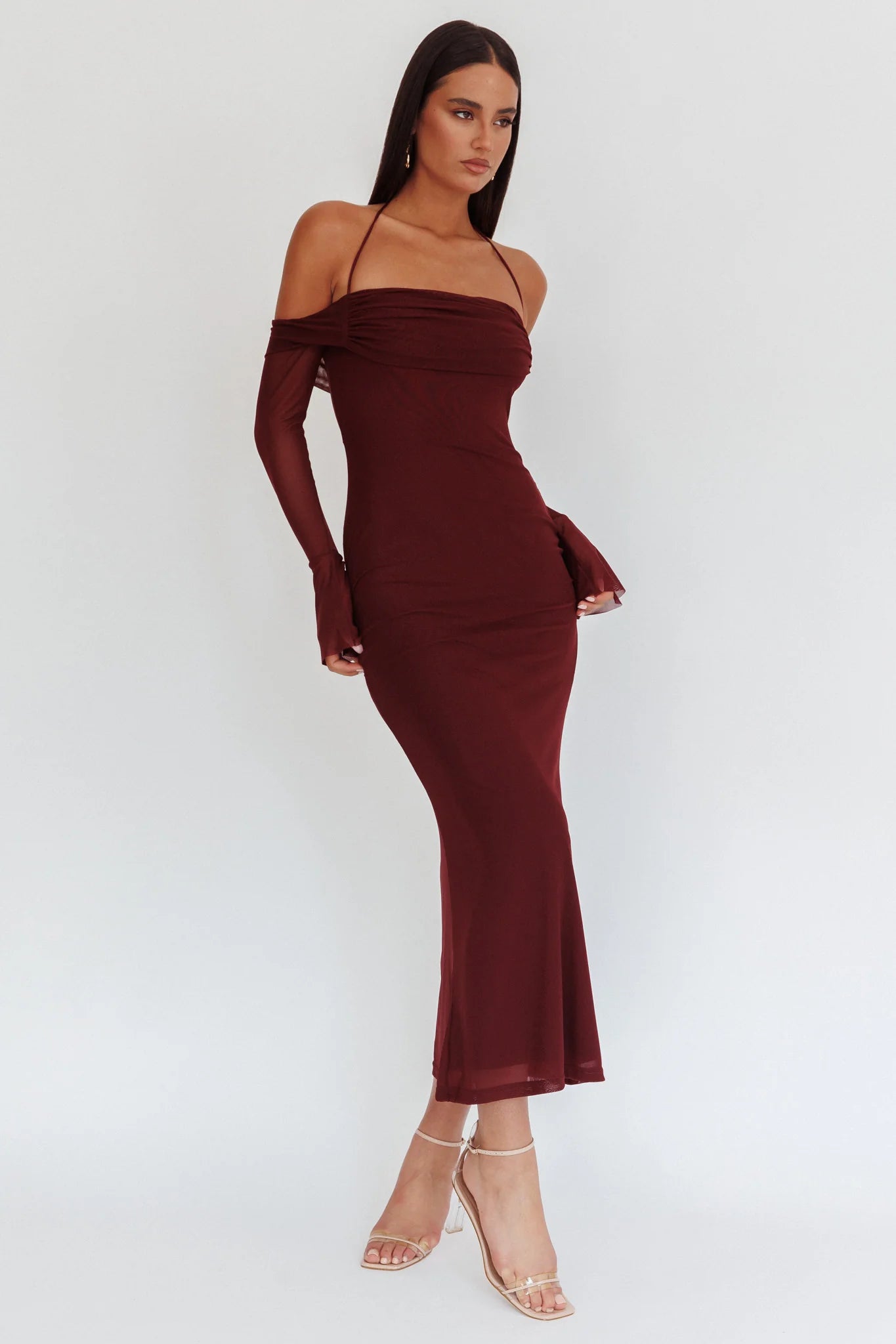 Numbers Game Off-Shoulder Halter Maxi Dress Chocolate