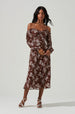 This midi dress features an off-shoulder neckline with supportive, self-tie halter straps. Ruffle trim leads to a cinched bust and fitted bodice. Long sleeves with elasticized cuffs. Smocked back.